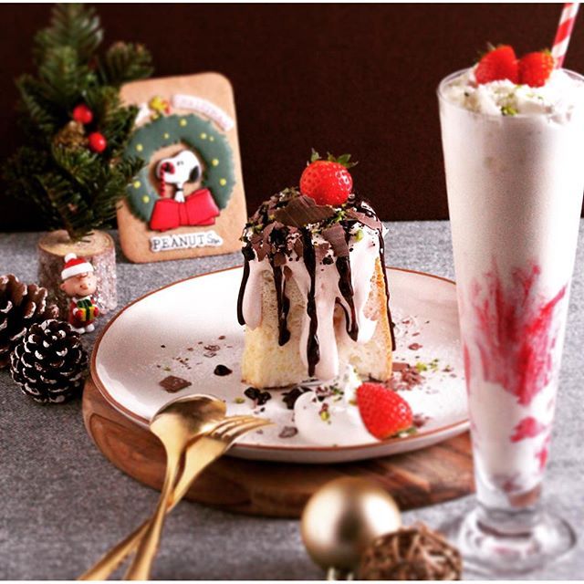 ピーナッツカフェの期間限定クリスマスメニューとして「エンジェルフードケーキ」がチョコレート仕立てになって登場。メレンゲたっぷりの口溶け軽い生地にチョコレートクリームとソースを贅沢にトッピングした一品で、甘酸っぱいイチゴとサワークリームがアクセントなんだそう。